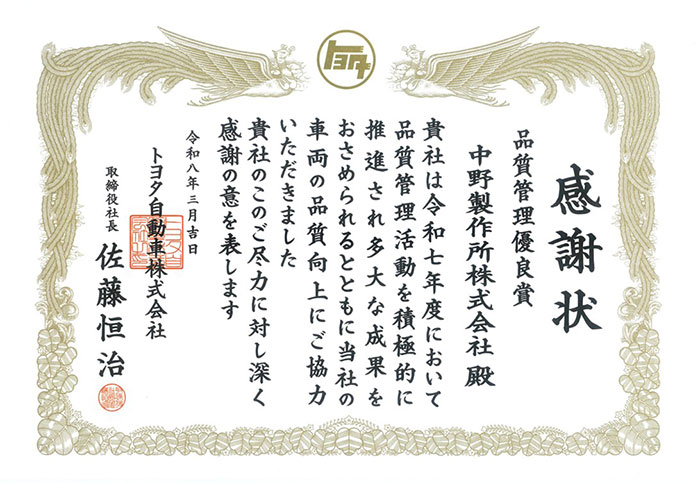 トヨタ自動車株式会社様から【品質管理優良賞】を授与されました。